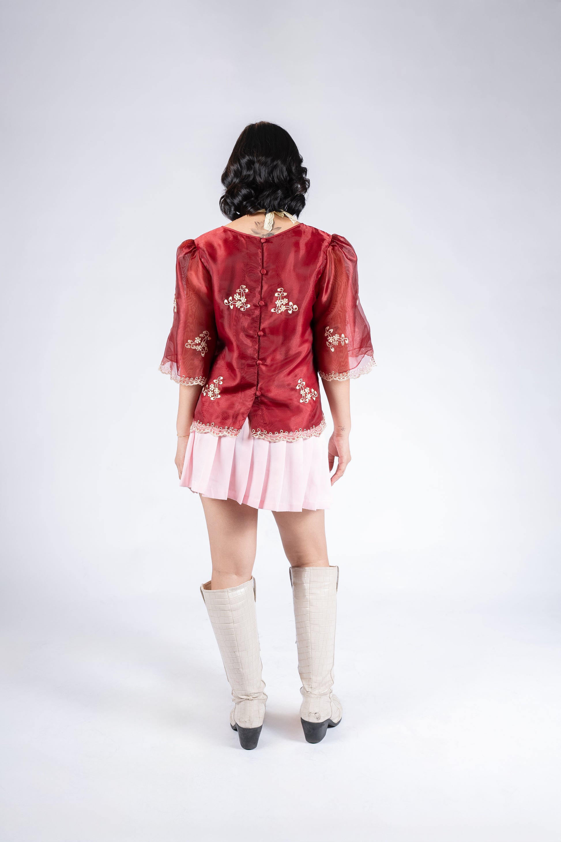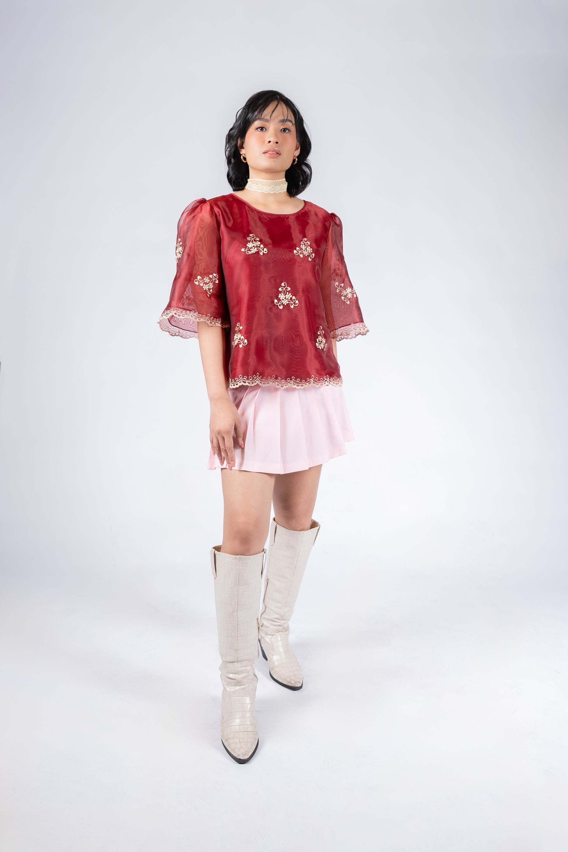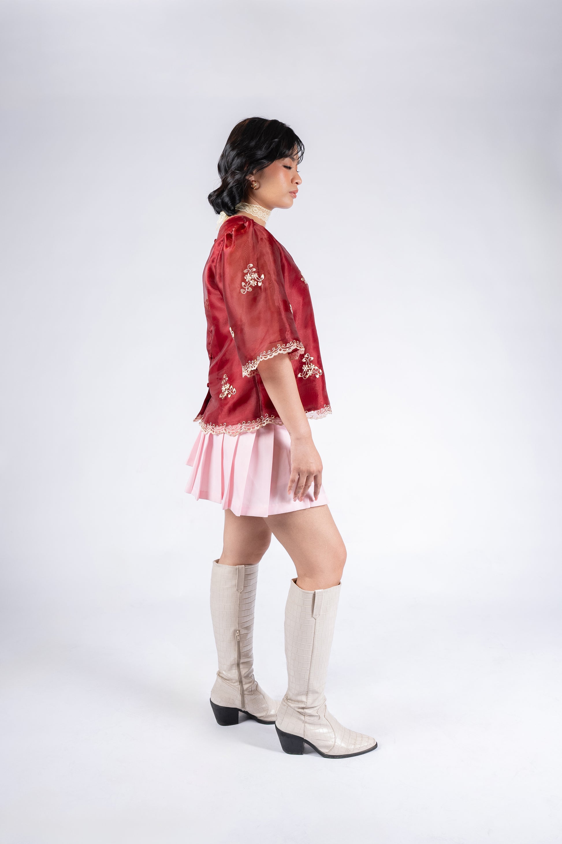 Introducing the elegant Amy Kimona - a must-have addition to your wardrobe. Crafted from luxurious organza, this round neck blouse showcases delicate lace and embroidery on the front, sides, and back. Exuding sophistication and exclusivity, it is perfect for any occasion.