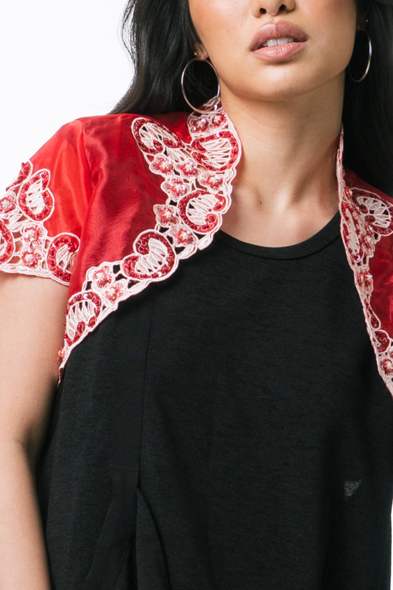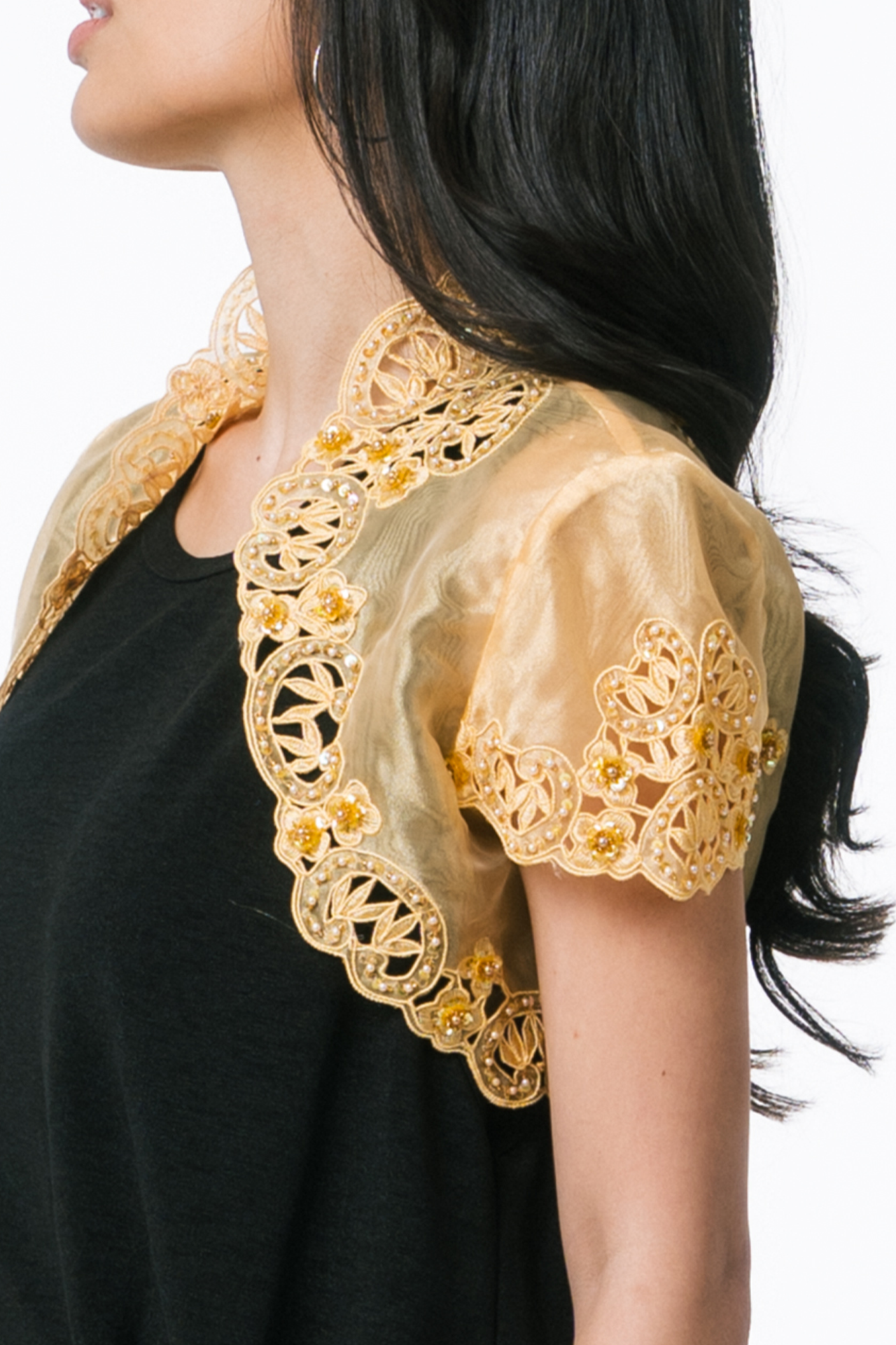 Add some flair to your outfit with the Angie Bolero! Made with delicate organza, this outerwear will keep you stylish and comfortable. Featuring intricate embroidery and bead detailing, this bolero is the perfect mix of elegance and fun. Stand out from the crowd with this unique piece.