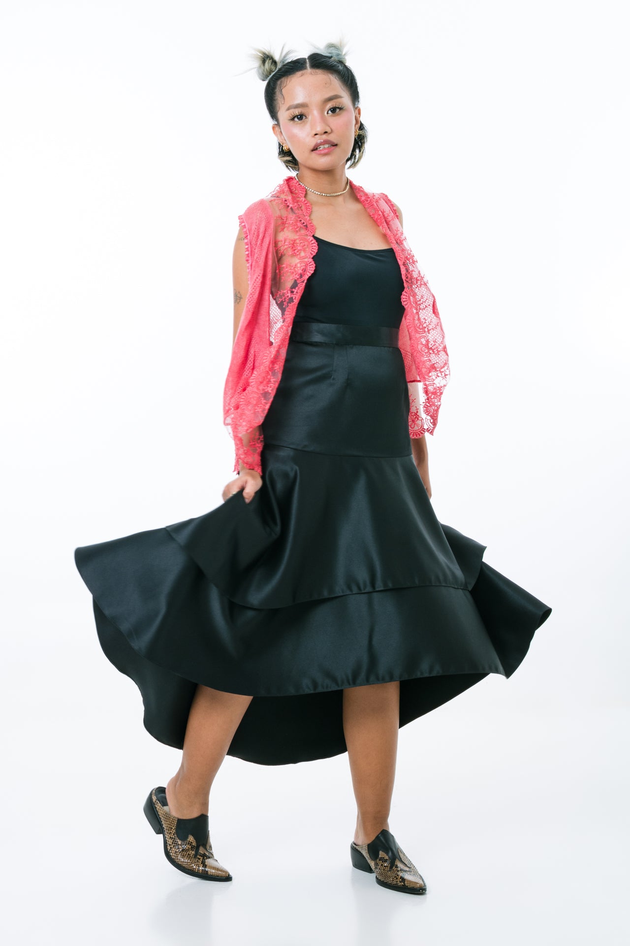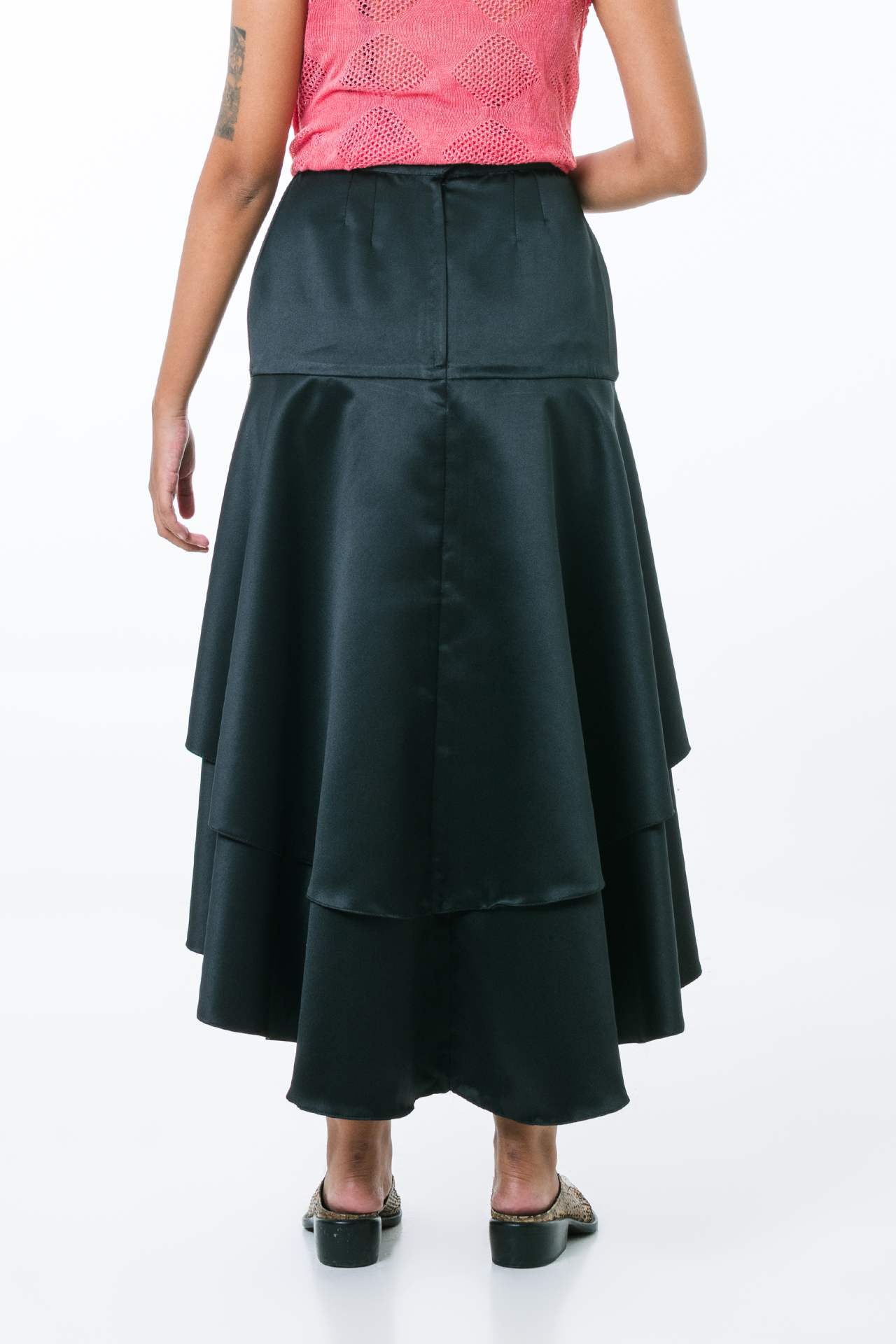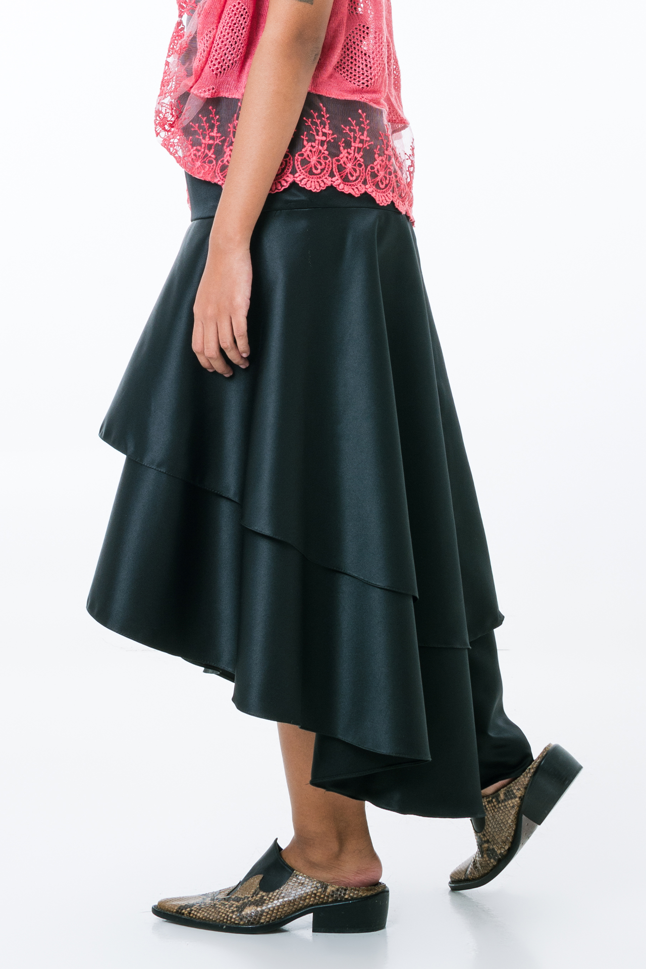 Introducing the Ava Skirt, an elegant, sophisticated statement piece crafted from luxurious Gazar fabric. Its trumpet mid-length cut creates a dramatic silhouette. With an asymmetrical cut and layering that will gracefully move as you walk. Be the envy of your next special event in the Ava Skirt.