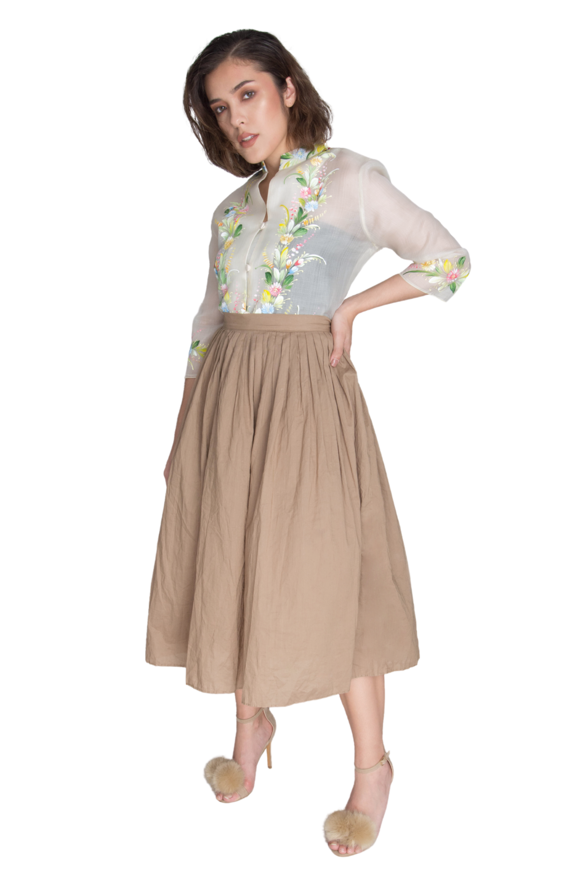 Make a statement with our Lira Lady Barong! Hand-painted with beautiful floral designs, this 3/4 sleeve Lady Barong is the perfect blend of tradition and modern style. Made from natural Cocoon silk, it has a unique off-white color and transparent appearance, resembling Piña without the sheen. Elevate your fashion game with this quirky and playful piece!