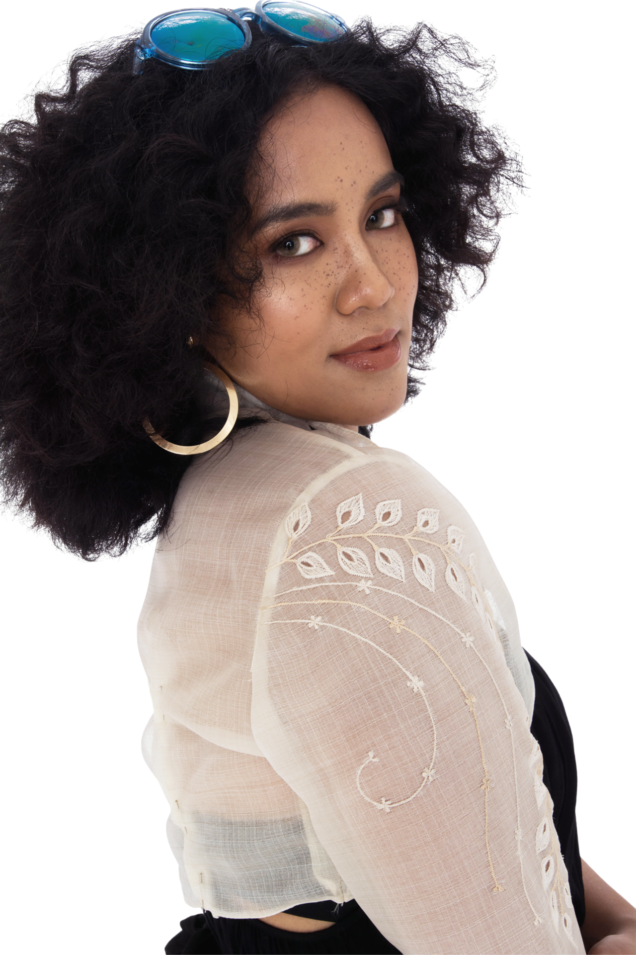The Ariella Bolero is the perfect addition to your formal wear collection. With delicate floral embroidery and 3/4 sleeves, this bolero adds an elegant touch to any outfit. Made from cocoon silk, it has a beautiful off-white color and a transparent texture reminiscent of piña, without the sheen. Elevate your look with this stunning and unique piece!