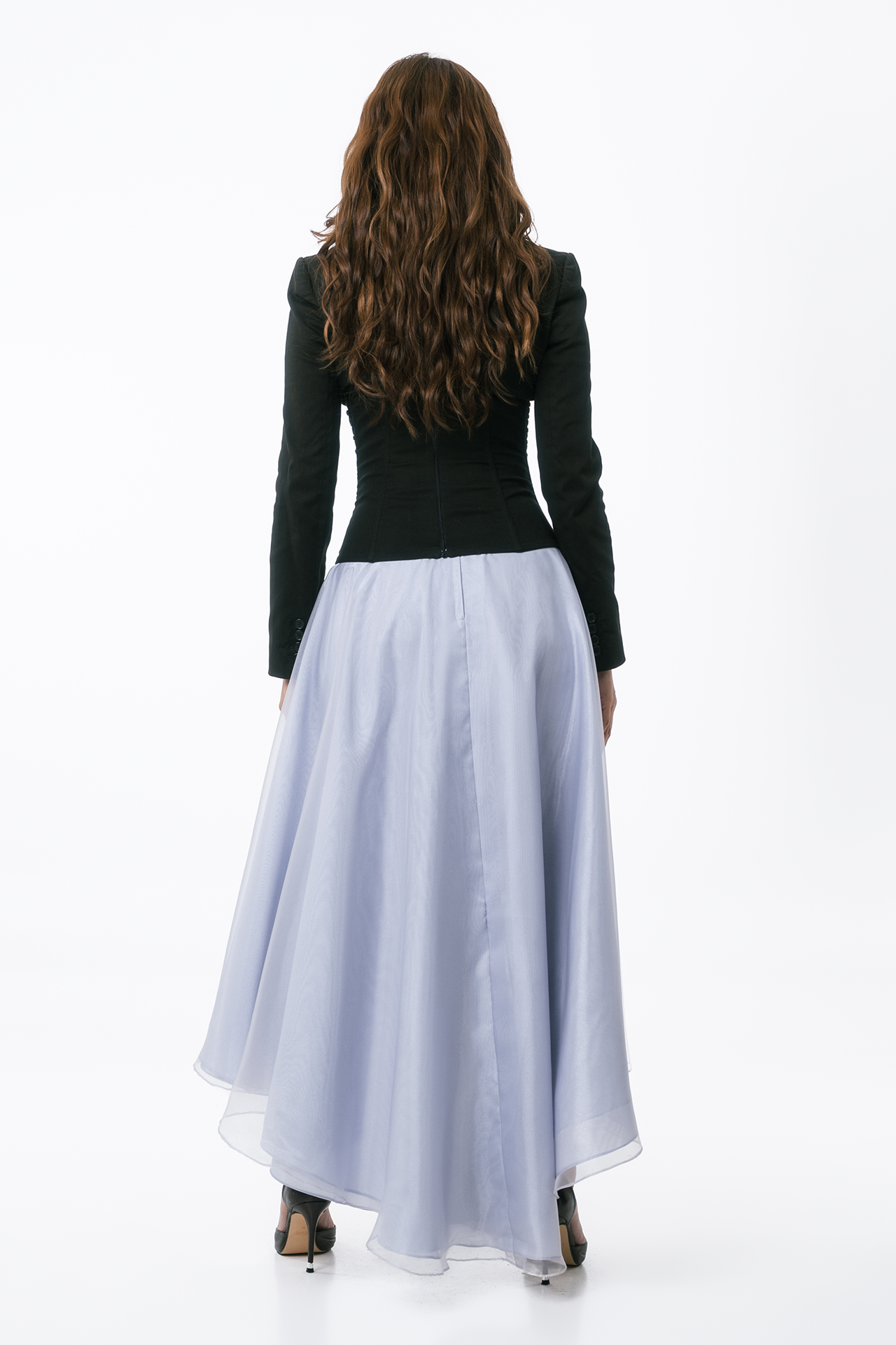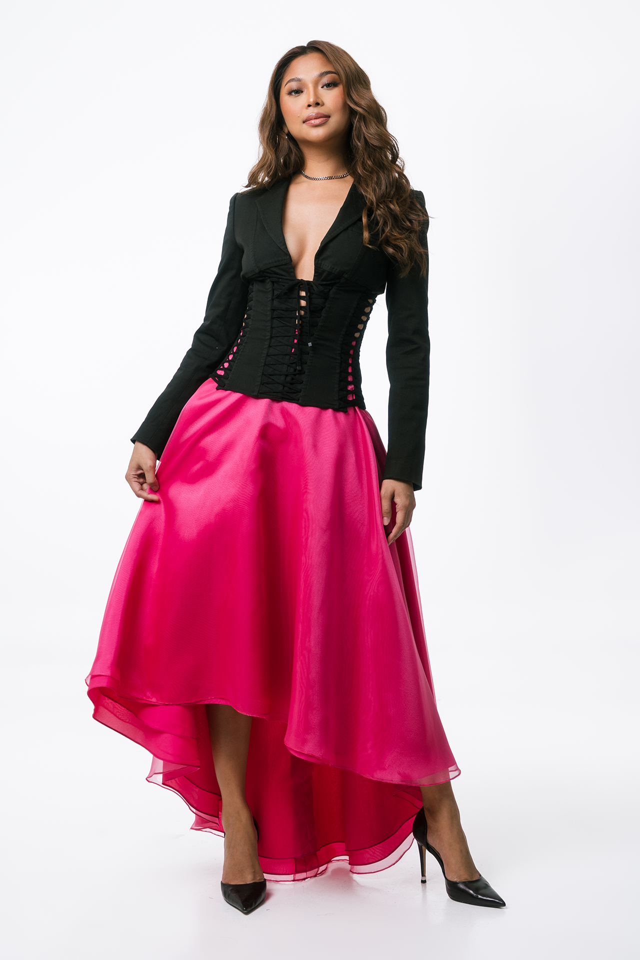 Indulge in the luxurious and exclusive design of our Dame Skirt in Organza. This midi length asymmetrical skirt features a back closure and is crafted from the finest organza fabric, creating a sleek and sophisticated silhouette. Elevate your style with this tasteful piece.