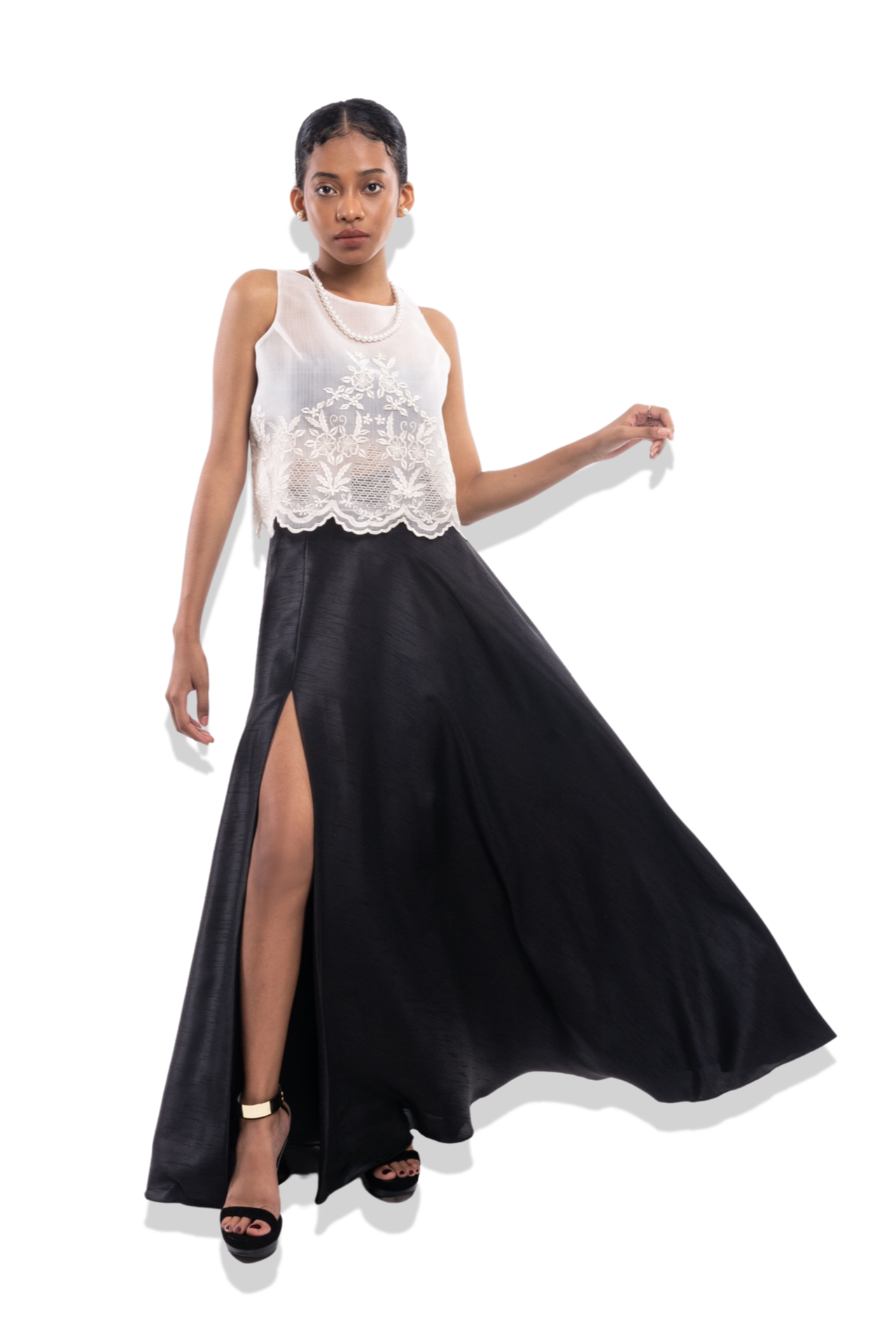 Unleash your daring side with the Dani Skirt! Made from luxurious Shantung textile, this full skirt features a thigh high slit for a bold and daring look. Stand out from the crowd and make a statement with this must-have piece.