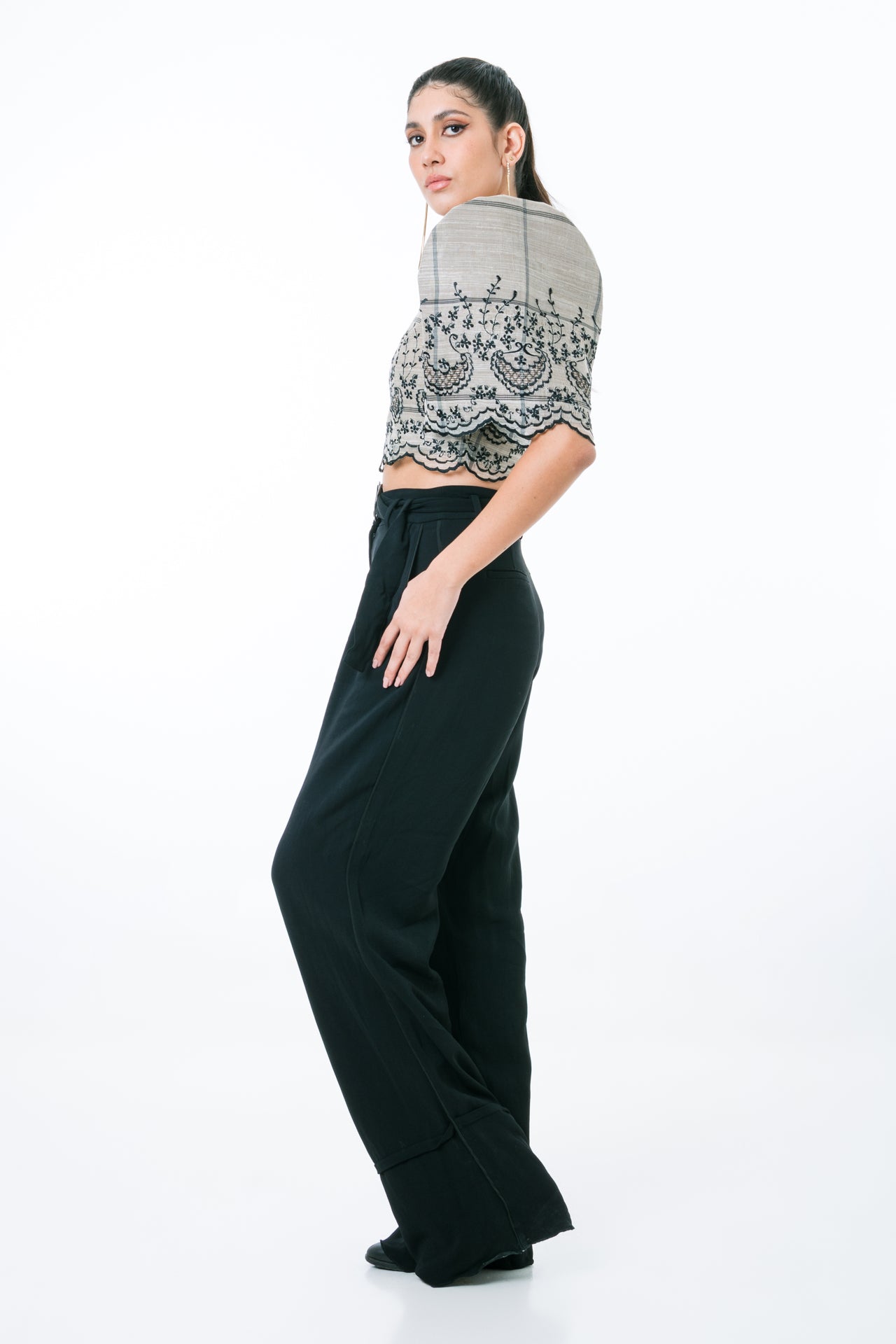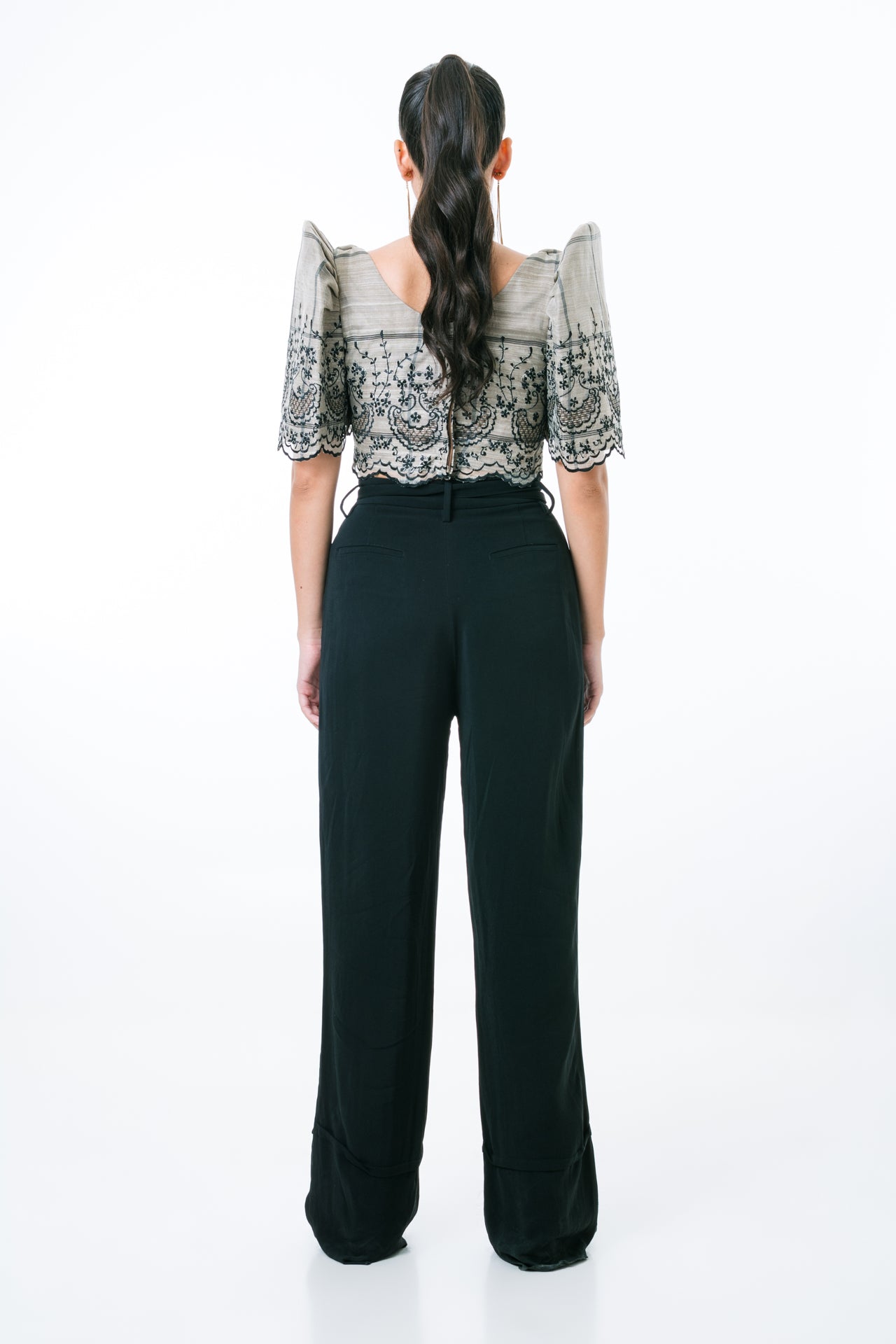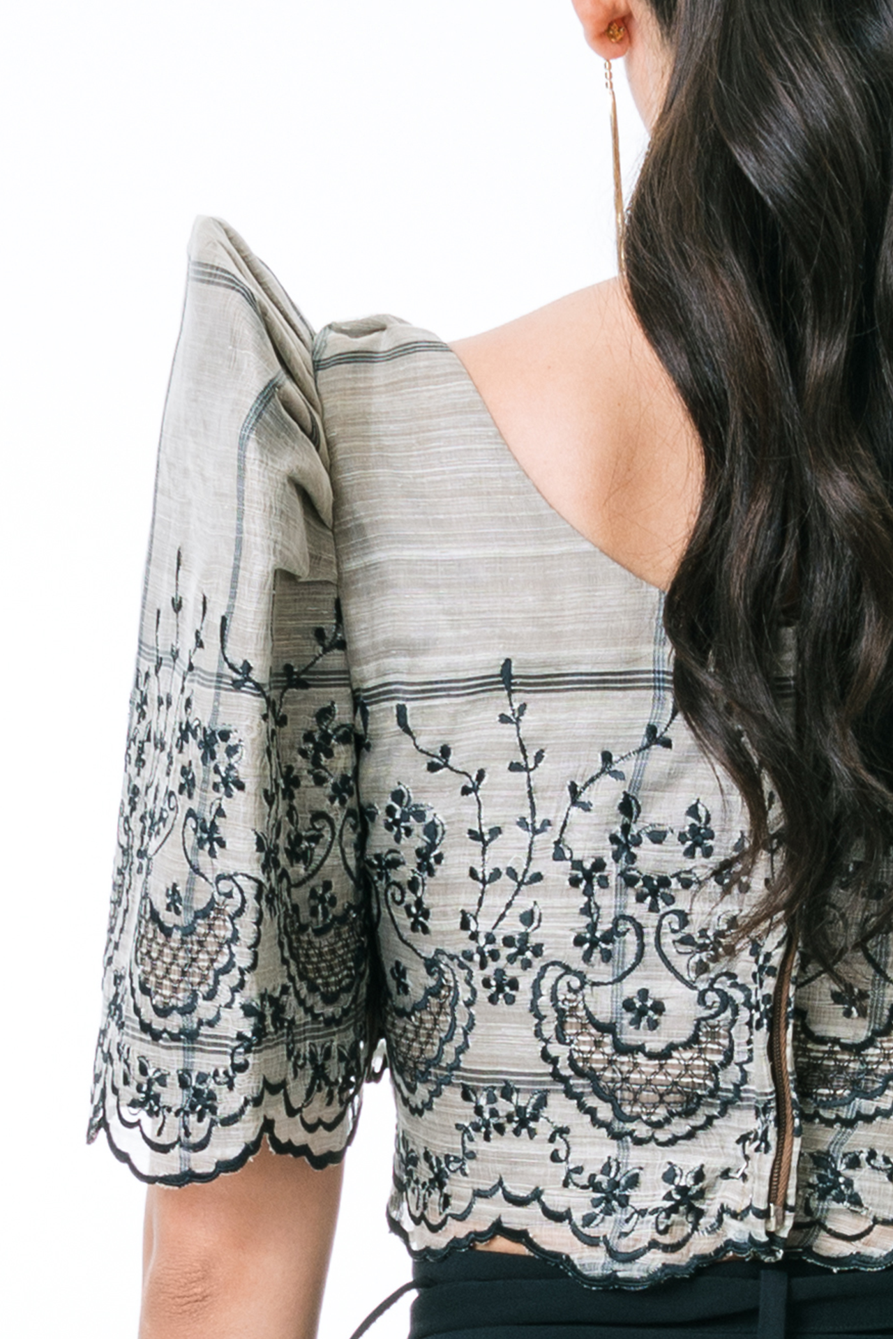 Our Emery Filipiniana Blouse is crafted from luxurious checkered Piña suksok fabric and features a flattering square neckline. The timeless silhouette is completed with intricate black embroidery details, while the blouse is lined with elegant mocha PDS fabric for a truly modern finish. Transform any ensemble into a chic and sophisticated look with this timeless piece.