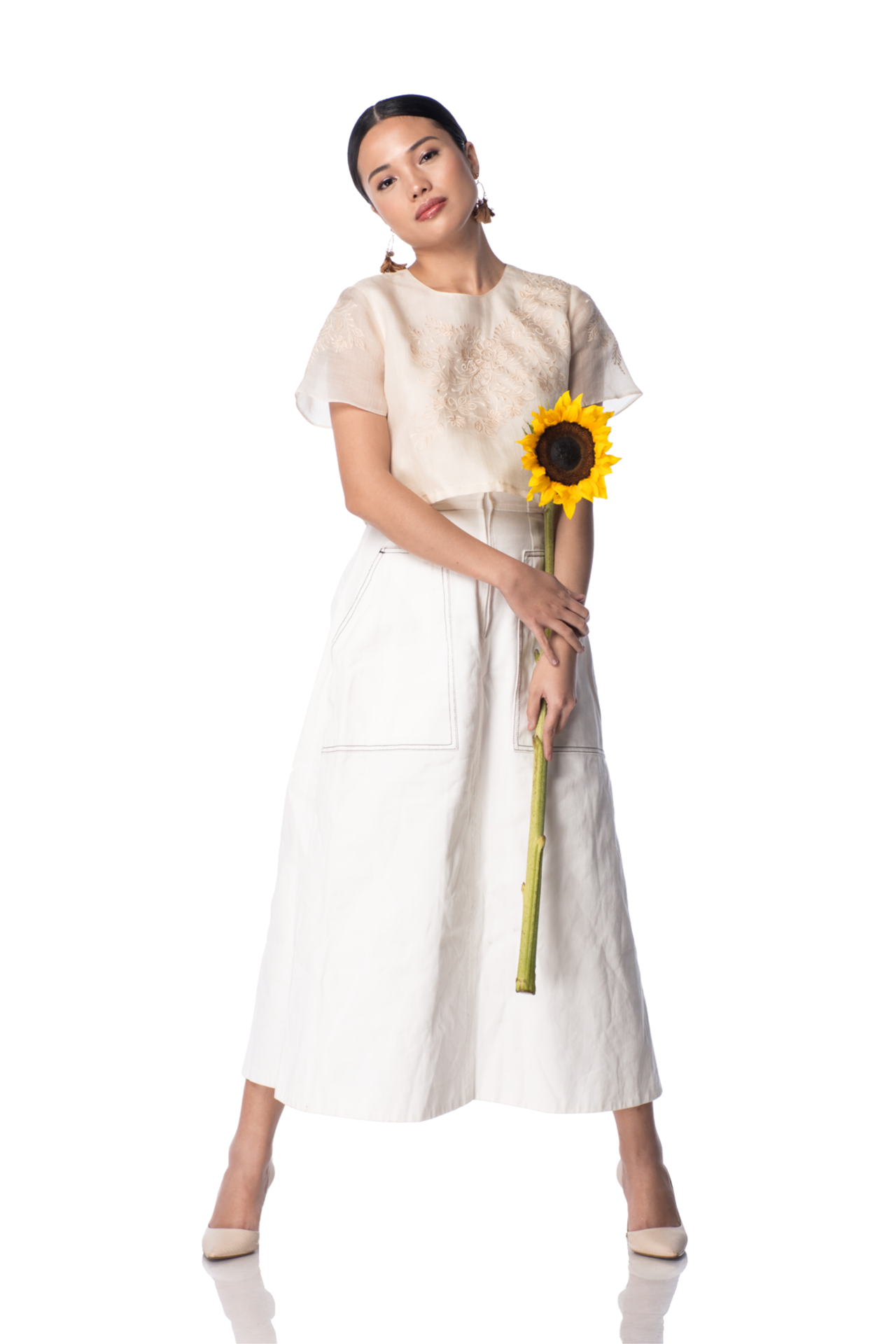 Add a touch of softness to your wardrobe with our Emily Blouse. Perfect for any occasion, this piece features a round neck and monotone floral embroidery details. Made from Cocoon silk, this natural fiber boasts an off-white color and transparent feature, similar to Piña but without the sheen, for a unique and chic look. Chic-ify your look with the Emily Blouse!
