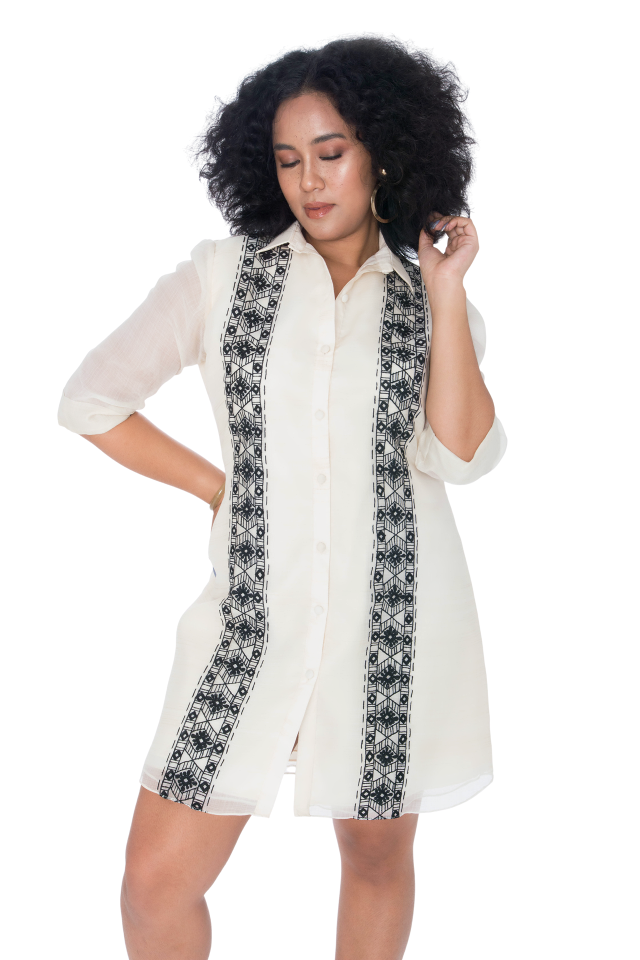 Get ready to soar in the Keanna Dress! This striking lady barong dress features a winged collar and intricate embroidery band design, creating a bold and adventurous look. Made from pure Cocoon silk, this dress is lightweight, off-white, and has a Piña-like transparency without the sheen. Prepare to turn heads and take risks in the Keanna Dress!