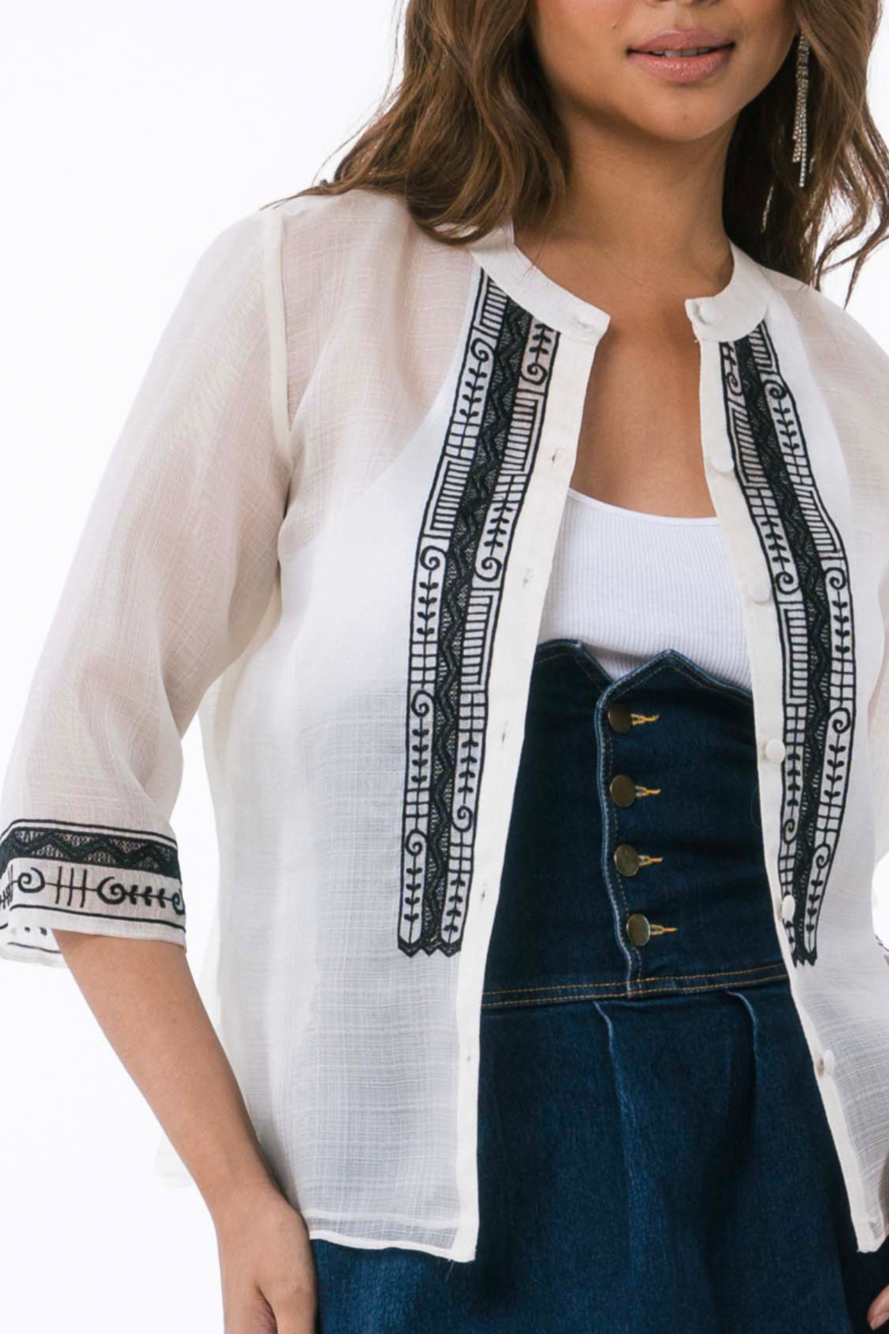 Introducing the Louise Lady Barong, crafted from the luxurious cocoon material. This elegant piece boasts delicate embroidery adorning the placket and side sleeves, accented by 7 single breasted buttons. With its sophisticated elbow length sleeves and round neckline, it's the epitome of tasteful and exclusive fashion.