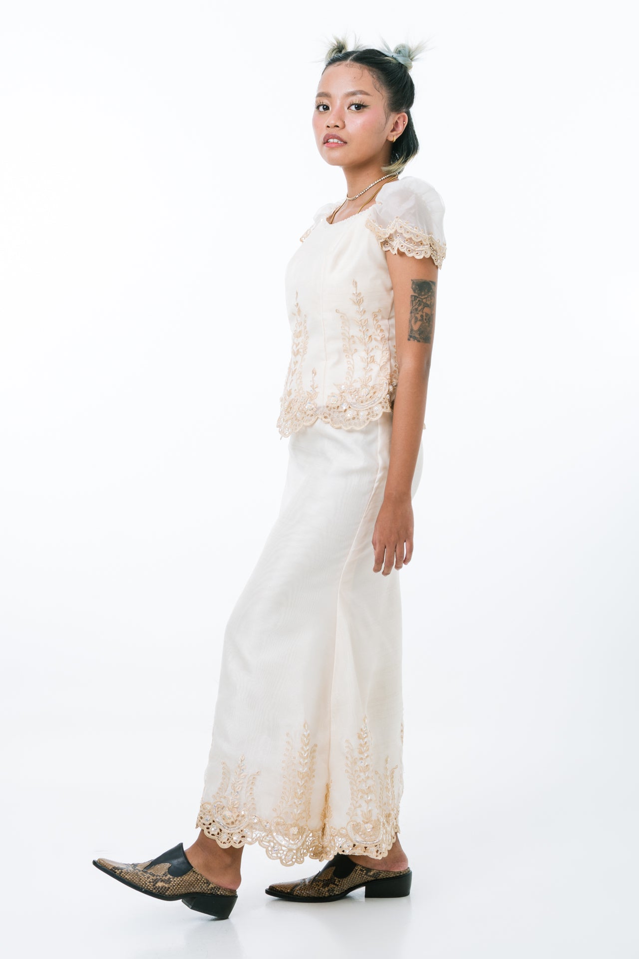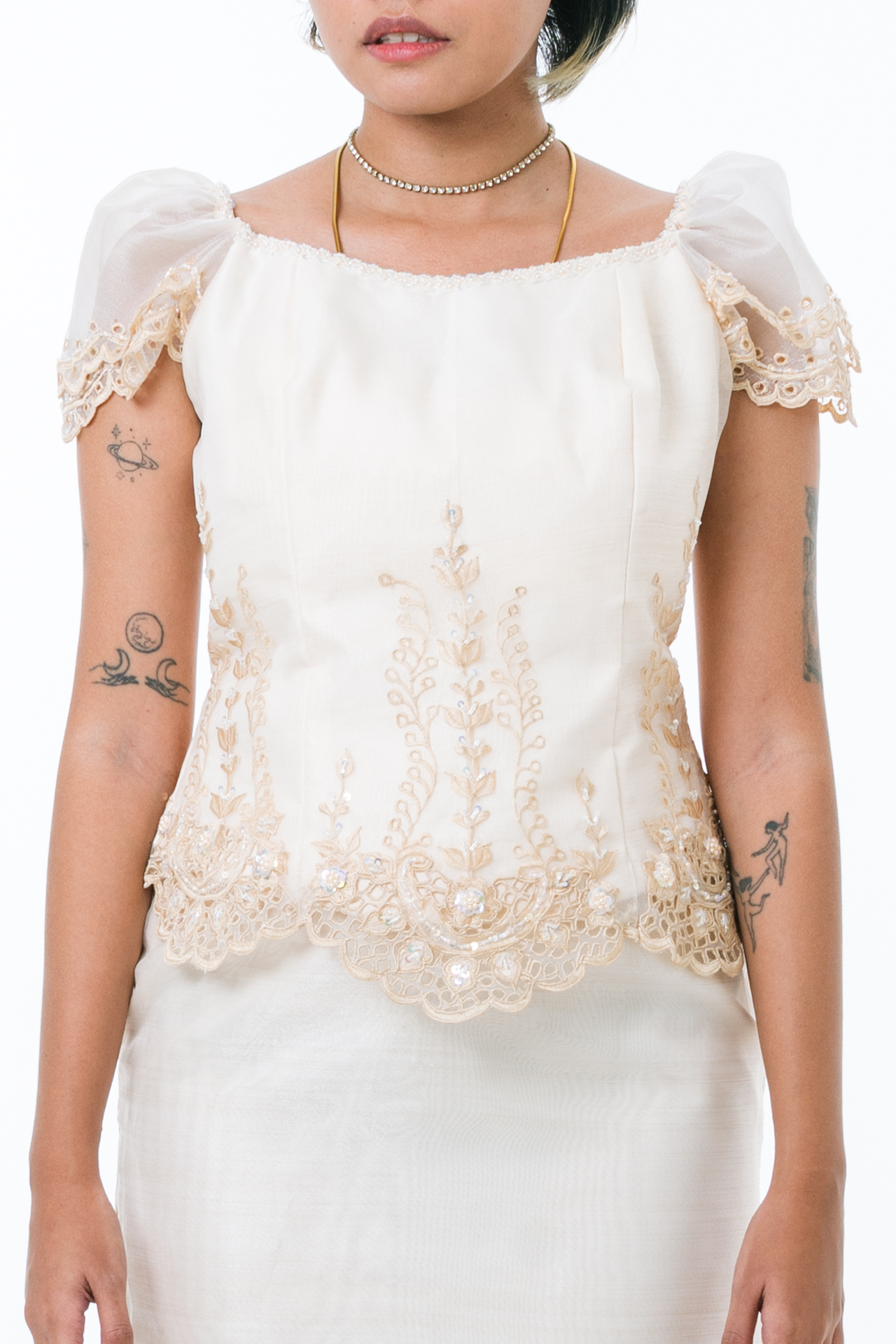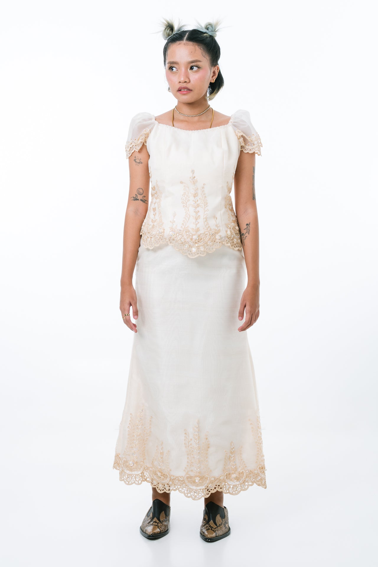 An exquisite ensemble of timeless elegance and modern sophistication, the Revy Blouse & Skirt features intricate beading and embroidery details in luxurious organza. The two-layer puff sleeve blouse features a bateau neckline, while the A-line skirt completes the Filipiniana look flawlessly. Both pieces exude sophistication and grace, making them ideal for special occasions.